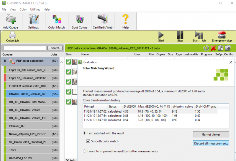 具體做法是在XMF流程中關(guān)閉色彩轉(zhuǎn)換功能,即可使用ORIS PressMatcher //Web進(jìn)行獨(dú)立的色彩管理,得益于JET PRESS 750S的大色域和顏色穩(wěn)定性,一般經(jīng)過2到3次循環(huán)校準(zhǔn),即可達(dá)到非常高的準(zhǔn)確度。