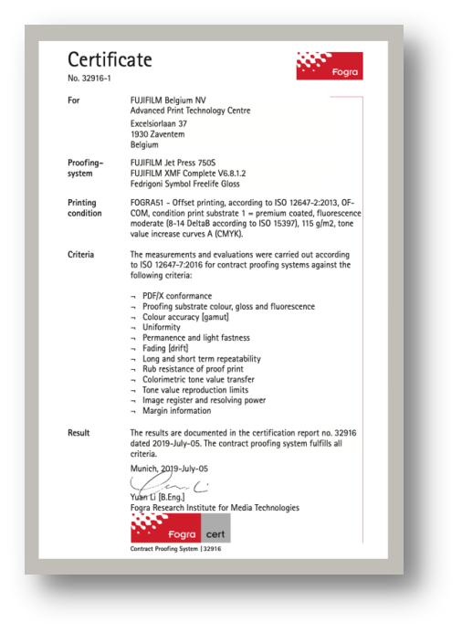五項(xiàng)測試分別依據(jù)ISO 12647-7:2016標(biāo)準(zhǔn)進(jìn)行評(píng)估,結(jié)果均可以達(dá)到ISO標(biāo)準(zhǔn)和Fogra Contract Proofing System的明確要求,德國Fogra機(jī)構(gòu)為Jet Press 750S頒發(fā)了5款認(rèn)證證書!