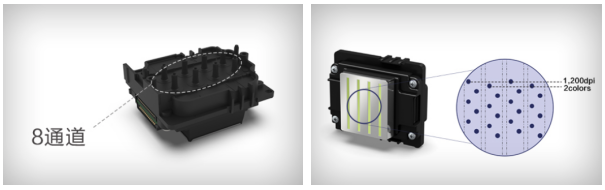 擁有8條進(jìn)墨通道,顏色配置更靈活,同色墨水使用相鄰4通道,能讓墨滴落點(diǎn)精度更準(zhǔn)確,在2色(4通道)打印的實(shí)際應(yīng)用過(guò)程中,可突破性達(dá)到1200dpi分辨率,堪稱業(yè)界峰值。因而可以減少畫(huà)面顆粒感,呈現(xiàn)更多畫(huà)面細(xì)節(jié),色彩過(guò)渡平滑、飽和度高。