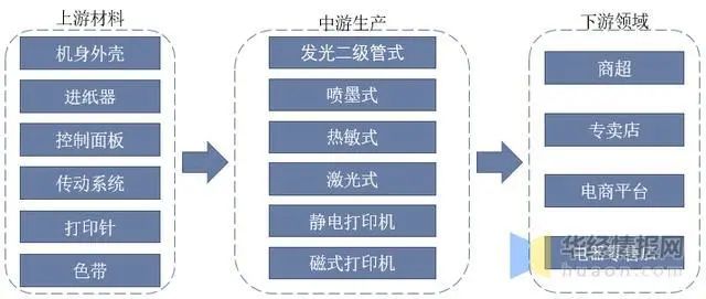 家用打印機產(chǎn)業(yè)鏈較為清晰,上游為打印機零部件制造,主要為機身外殼、進紙器、控制面板、傳動系統(tǒng)、打印針、色帶;中游為打印機制造,主要為發(fā)光二極管式打印機、噴墨式打印機、熱敏式打印機、激光式打印機、靜電打印機、磁式打印機;下游為家用打印的銷售渠道,主要為商超、專賣店、電商平臺、電器零售店。