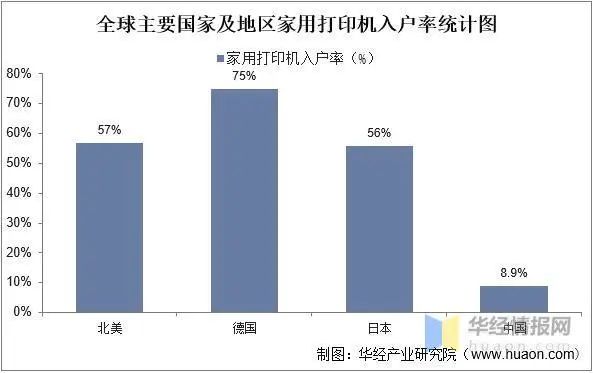全球主要國家地區(qū)家用打印機入戶率統(tǒng)計圖