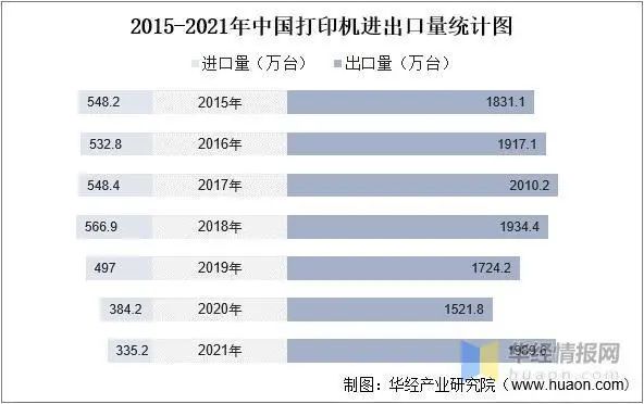 2015-2021年中國打印機進出口量統(tǒng)計圖