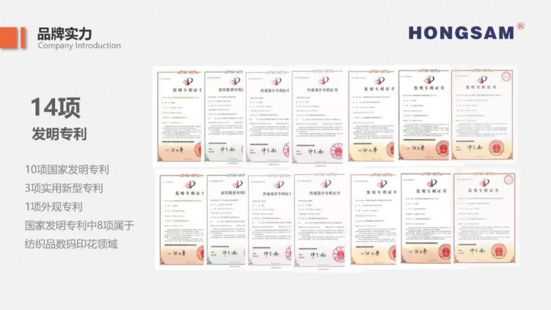 鴻盛數(shù)碼通過持續(xù)技術(shù)研發(fā)及工藝創(chuàng)新,降低了客戶對(duì)進(jìn)口墨水的依賴度及采購(gòu)成本,促進(jìn)行業(yè)向節(jié)能環(huán)保、清潔生產(chǎn)方向轉(zhuǎn)型。企業(yè)針對(duì)不同系列產(chǎn)品,建立專項(xiàng)研發(fā)項(xiàng)目組,保證每款產(chǎn)品的持續(xù)跟進(jìn)優(yōu)化。截止目前,鴻盛數(shù)碼擁有14項(xiàng)專利,其中10項(xiàng)國(guó)家發(fā)明專利,其中8項(xiàng)為數(shù)碼印花類的專利,囊括鴻盛數(shù)碼紡織五朵金花“絲美特®”酸性染料墨水、“鴻美®”高溫分散墨水,“捷特絲®”紡織涂料墨水、“銳美®”活性染料墨水、鴻盛陽(yáng)離子染料墨水。