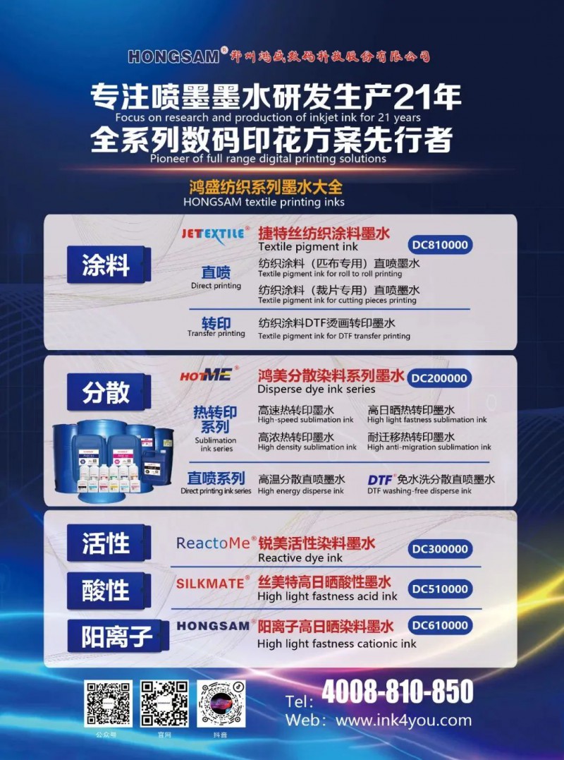 “捷特絲®”紡織涂料墨水作為國(guó)內(nèi)推出較早的一款納米顏料數(shù)碼噴墨墨水,在2006年就獲得了該墨水的發(fā)明專利,也受到了國(guó)家創(chuàng)新基金立項(xiàng)支持及市場(chǎng)推廣應(yīng)用,同時(shí),鴻盛數(shù)碼也參與制定行業(yè)標(biāo)準(zhǔn),宣貫標(biāo)準(zhǔn),為中國(guó)噴墨顏料墨水應(yīng)用,引導(dǎo)和開辟了道路。 “捷特絲®”紡織涂料墨水彌補(bǔ)了國(guó)內(nèi)納米顏料數(shù)碼噴墨的不足,在牢度、手感、顏色、流暢性方面都有不錯(cuò)的表現(xiàn),滿足客戶對(duì)棉,滌棉,滌錦,棉錦,滌綸,錦綸,絲綢等面料的應(yīng)用,可謂是一種墨水,所有織物。捷特絲紡織墨水的相關(guān)介紹見《緊隨市場(chǎng)腳步 | 鴻盛數(shù)碼20年深耕紡織涂料市場(chǎng)》