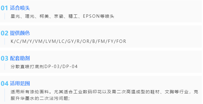 高溫分散染料墨水具有優(yōu)異的色牢度等優(yōu)點,能夠很好解決熱轉(zhuǎn)印工藝不耐高溫、色遷移牢度差等問題,避免集裝箱長途運輸過程中或在成衣熨燙過程中發(fā)生二次升華搭色等情況造成的巨大損失。
