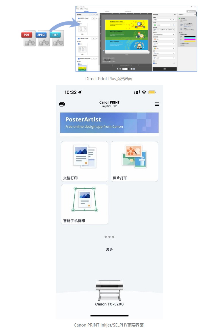 imagePROGRAF TC-5200支持多種打印應(yīng)用方案和設(shè)備管理方案,圖紙輸出時(shí)可采用免費(fèi)贈(zèng)送的Direct Print Plus應(yīng)用方案:多種類型的文件可直接進(jìn)行拖拽式打印,無需打開文件應(yīng)用程序來選定紙張來源和尺寸大小,讓打印小白也能沒有壓力地實(shí)現(xiàn)多種格式和尺寸的打印輸出。此外,采用Canon Print Inkjet/SELPHY軟件應(yīng)用方案,用戶通過手機(jī)、平板電腦等智能移動(dòng)終端就可以完成打印、復(fù)印、耗材余量確認(rèn)、固件升級(jí)等操作,擺脫傳統(tǒng)電腦臺(tái)式機(jī)的操作束縛,讓辦公更輕松。