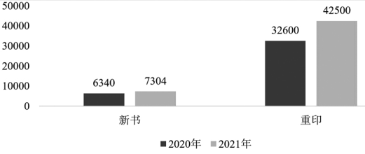 從數(shù)字印刷品種分布看,41家出版單位中,2020年數(shù)字印刷共計(jì)38940個(gè)品種,其中新書6340個(gè)品種、重印書32600個(gè)品種。2021年數(shù)字印刷共計(jì)49804個(gè)品種,同比增長(zhǎng)28%,其中新書7304個(gè)品種,同比增長(zhǎng)15%;重印書42500個(gè)品種,同比增長(zhǎng)30%。