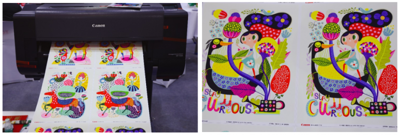 佳能imagePROGRAF GP-540/520作為佳能首次搭載熒光色水性顏料墨水的大幅面輸出設(shè)備,憑借其突出的色彩表現(xiàn)能力,成為本界展會(huì)上裝飾畫行業(yè)當(dāng)之無愧的明星產(chǎn)品。GP系列打印機(jī)配備的熒光色墨水可以打印熒光專色,在特殊光線照射下會(huì)表現(xiàn)出熒光效果,可以制作出更具有創(chuàng)造性的作品。同時(shí)GP-540/520的數(shù)據(jù)處理技術(shù)可對(duì)熒光粉色墨水與其他顏色墨水在紙面上的疊加方式進(jìn)行優(yōu)化,使輸出作品的特定區(qū)域脫穎而出,實(shí)現(xiàn)明亮柔和且層次豐富的色彩再現(xiàn),令圖像表達(dá)更具沖擊力。此外GP-540/520機(jī)型搭載了紅、橙、綠、紫四種特殊色墨水,進(jìn)一步提高了輸出作品的色彩飽和度,實(shí)現(xiàn)寬廣的色域表現(xiàn),能夠完美的呈現(xiàn)裝飾版畫中的色彩表達(dá)。