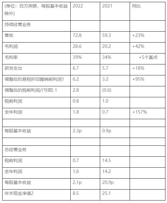 · 持續(xù)經(jīng)營業(yè)務(wù)的研發(fā)支出投資增加了670萬英鎊,比2021年增加了100萬英鎊,主要用于投資ImagineX創(chuàng)想平臺(tái)和產(chǎn)品路線圖