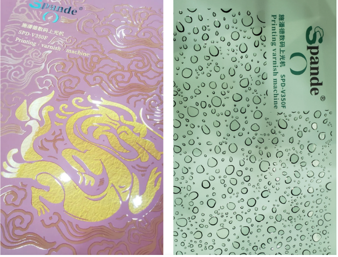 SPD-VF350 數(shù)碼上光機(jī)采用按需噴墨技術(shù),可直接進(jìn)行局部UV,省去了傳統(tǒng)上光的制版環(huán)節(jié),真正做到了“一張起印,張張不同”。