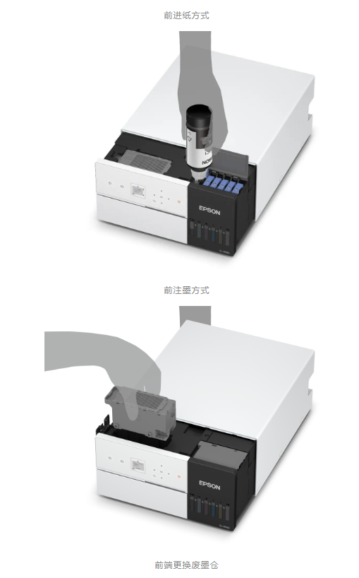 愛普生SL-D580采用前操作模式,使用前進(jìn)紙、前出紙和前端注墨的方式,維護(hù)箱的更換也可以在前端完成,無需額外預(yù)留操作空間。這種設(shè)計不僅方便用戶操作,還使得打印機(jī)可以滿足狹小的空間的擺放需求,例如屜柜或者角落,便于用戶擺放,從而更加節(jié)省空間。