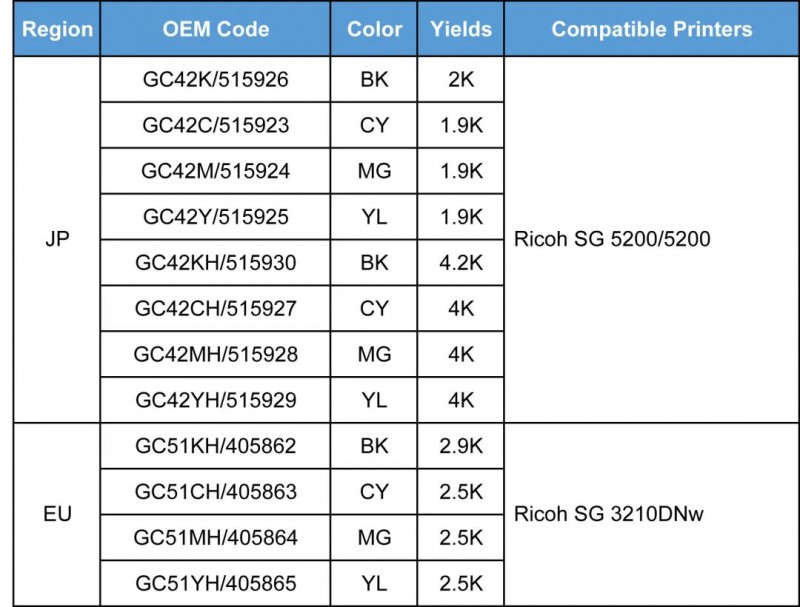 2021年3月,理光在日本發(fā)布SG 5200桌面打印機,其適用墨盒型號為GC42K/C/M/Y及GC42KH/CH/MH/YH。