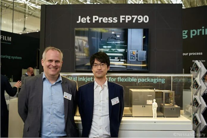 從左起,富士膠片包裝業(yè)務(wù)EMEA負責(zé)人Manuel Schrutt和富士膠片數(shù)字打印系統(tǒng)經(jīng)理Akashi Arai合影Nessan Cleary