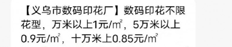 現(xiàn)在我們再回過頭來看下這則報價信息,上述數(shù)碼印花報價是0.9元/㎡,假設(shè)需要加工的面料幅寬為150,經(jīng)過換算得出該款面料的加工費為1.45元/米。這樣一看,這家企業(yè)此番操作大概率是在博眼球,用非常規(guī)單位營造出一種低價的假象。