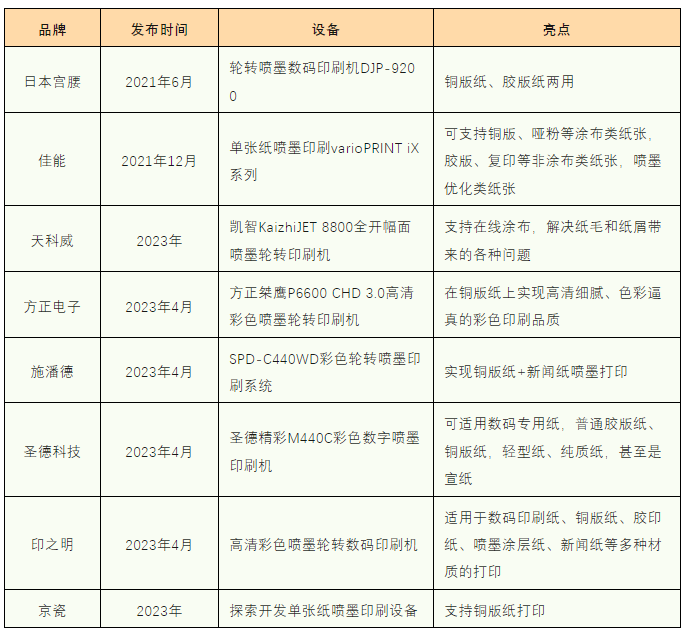 經(jīng)過(guò)記者梳理發(fā)現(xiàn),2021年至2023年,以方正電子、圣德科技、施潘德、天科威等為代表的國(guó)產(chǎn)品牌,以及佳能、日本宮腰等國(guó)際品牌,均攜各自可支持銅版紙打印的噴墨印刷設(shè)備閃亮登場(chǎng)。