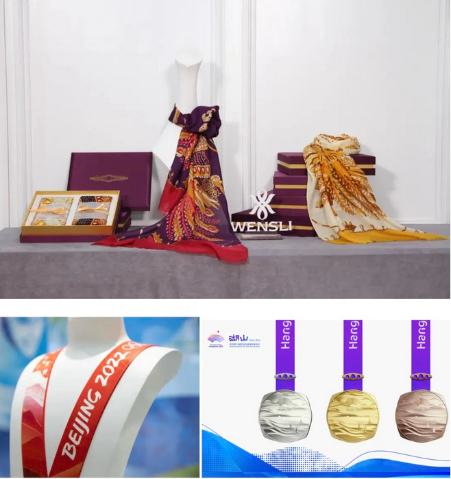 萬(wàn)事利為2022年北京冬奧會(huì)(左)、2022年杭州亞運(yùn)會(huì)(右)提供真絲獎(jiǎng)牌綬帶定制服務(wù)