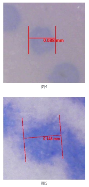當(dāng)墨滴打印到表面光滑、密度較高的介質(zhì)上,比如車(chē)貼,墨滴擴(kuò)散范圍較?。ㄈ鐖D4);而如果打印表面較粗糙的介質(zhì)上,比如紙張,墨滴擴(kuò)散范圍較大(如圖5)。