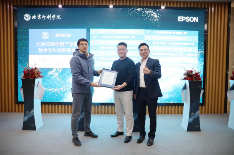 隨后,愛普生商用及工業(yè)產(chǎn)品解決方案事業(yè)部總經(jīng)理王金城、部門經(jīng)理張鋒共同為參與北京印刷學(xué)院產(chǎn)學(xué)研聯(lián)合學(xué)生培養(yǎng)基地的數(shù)字記憶河北創(chuàng)新科技有限公司、上海大總印刷器材有限公司、深圳市刺猬智趣時尚科技有限公司、艾利丹尼森(中國)有限公司等17家合作伙伴頒發(fā)“北京印刷學(xué)院產(chǎn)學(xué)研學(xué)生培養(yǎng)基地”認(rèn)證書,現(xiàn)場掌聲雷動,氛圍熱烈。
