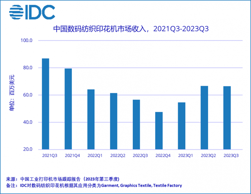 IDC發(fā)布的《中國(guó)工業(yè)打印機(jī)市場(chǎng)跟蹤報(bào)告(2023年第三季度)》顯示,2023年第三季度全球數(shù)碼紡織印花機(jī)的市場(chǎng)收入為1.31億美元,同比上升高達(dá)13.7%。其中,中國(guó)品牌市場(chǎng)收入為7800萬美元,占整體市場(chǎng)的59.5%,同比增長(zhǎng)22.4%。