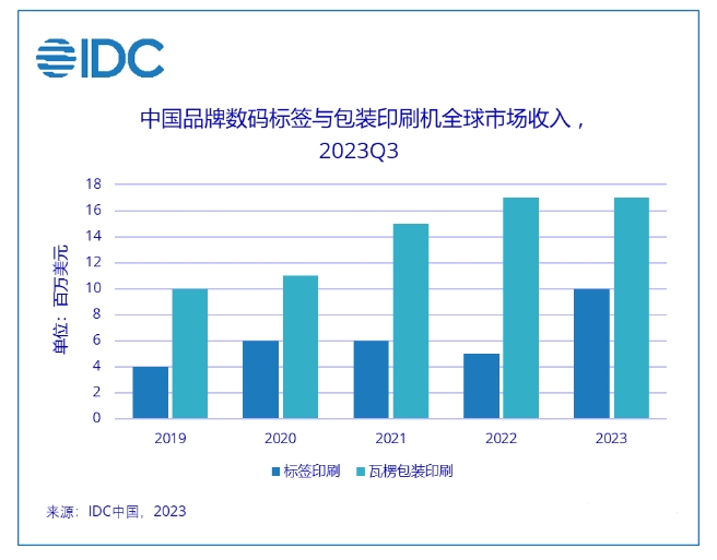 IDC《全球工業(yè)打印機(jī)市場(chǎng)季度跟蹤報(bào)告》顯示,2023 年第三季度,全球數(shù)碼標(biāo)簽和包裝印刷機(jī)的市場(chǎng)收入為1.28 億美元,同比下降6.25%。其中,中國(guó)品牌逆勢(shì)上升,市場(chǎng)收入為2,650 萬美元,占整體市場(chǎng)的21%,同比增長(zhǎng) 15.4%。