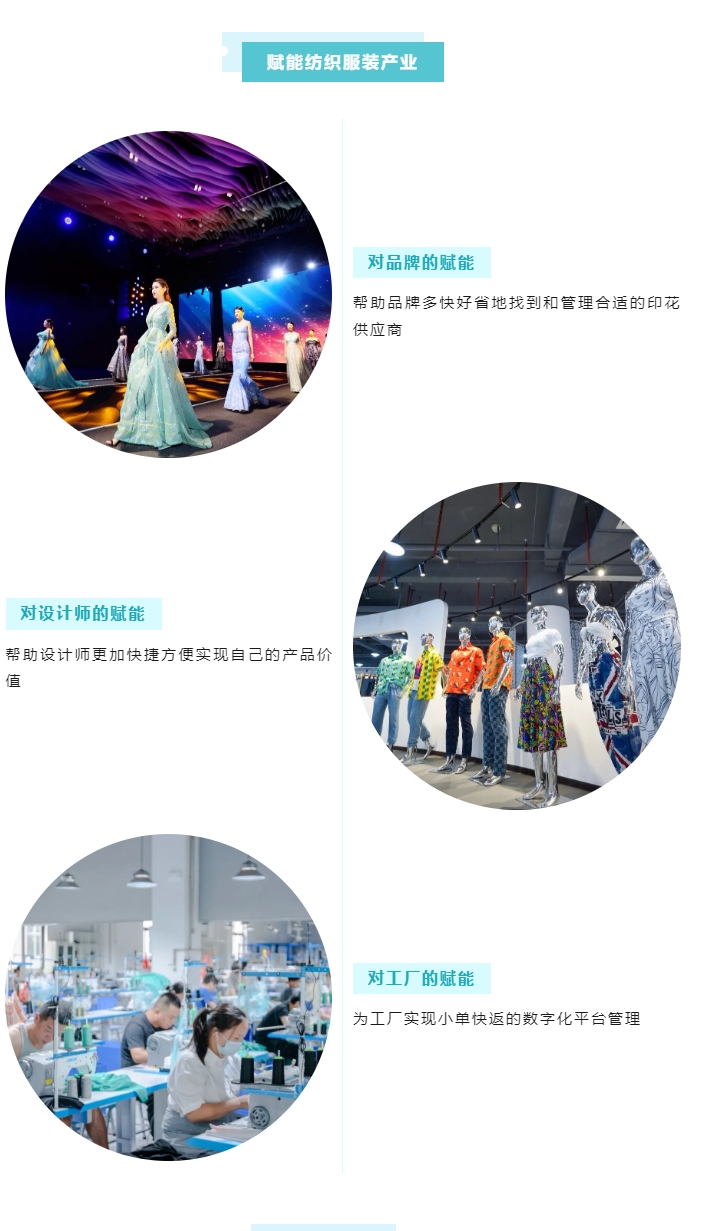 華印數(shù)碼印花云平臺(tái)通過(guò)先進(jìn)的物聯(lián)網(wǎng)技術(shù),連接了品牌方、設(shè)計(jì)師、數(shù)碼印花工廠,建立了一個(gè)高效、智能、完善的數(shù)碼印花供應(yīng)鏈,實(shí)現(xiàn)數(shù)字化生產(chǎn)、信息化管理。幫助用戶更快、更好、更經(jīng)濟(jì)地做到小單快發(fā)的柔性制造能力。目前華印云已經(jīng)連接了數(shù)百家工廠,幾十個(gè)服裝品牌與電商平臺(tái),上千個(gè)設(shè)計(jì)師,正在為中國(guó)數(shù)碼印花行業(yè)確立新模式、新標(biāo)準(zhǔn)、新動(dòng)能,成為廣清紡織服裝產(chǎn)業(yè)有序轉(zhuǎn)移園打造國(guó)內(nèi)首家綠色環(huán)保數(shù)碼印花產(chǎn)業(yè)園的數(shù)字孿生平臺(tái)和線上支撐。