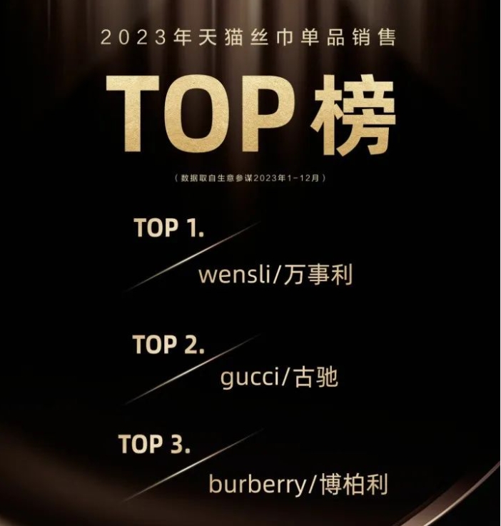 最近,一則天貓2023年度絲巾/圍巾類目銷售數(shù)據(jù)引發(fā)了強(qiáng)烈關(guān)注。根據(jù)生意參謀2023年1-12月的數(shù)據(jù)現(xiàn)顯示,2023天貓“絲巾/圍巾”類目下,銷量冠軍是來(lái)自于萬(wàn)事利的一款雙面印花方巾,兩大奢侈品品牌Gucci和Burberry旗下的雙G緹花羊毛真絲雙面圍巾和羊毛緹花圍巾分別排在第二和第三。