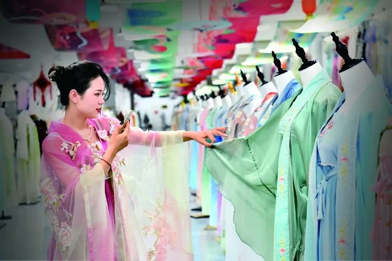 目前,曹縣有漢服上下游企業(yè)2186家、網(wǎng)店12797個,從業(yè)者近10萬人。隨著訂單紛至沓來,數(shù)碼印花、高速繡花等新配套、新產(chǎn)能開始落地。今年,新店鋪開業(yè)如雨后春筍,曹縣僅大集鎮(zhèn)、安蔡樓鎮(zhèn)及周邊鄉(xiāng)鎮(zhèn)的數(shù)碼印花廠就超過100家。