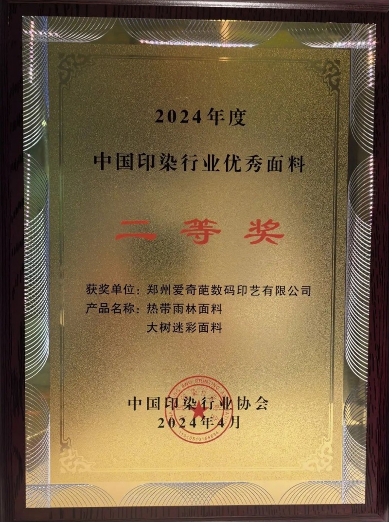 大會(huì)宣布了 《關(guān)于發(fā)布2024 年度中國(guó)印染行業(yè)優(yōu)秀面料獲選產(chǎn)品及企業(yè)名單的決定》,愛奇葩“歲月溝壑”面料榮獲2024年度中國(guó)印染行業(yè)優(yōu)秀面料一等獎(jiǎng),“熱帶雨林”面料、“大樹迷彩”面料榮獲二等獎(jiǎng)。