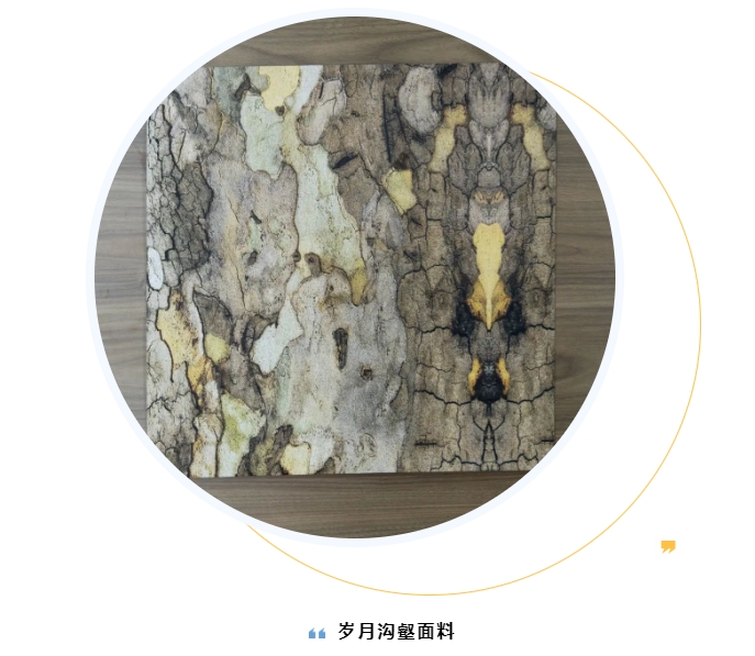 “歲月溝壑”是在軟木布上進(jìn)行樹皮圖案的印花制作,軟木布是以天然樹皮“栓皮”為原料,不但具有自然古樸、粗獷的大自然之美,還具有吸音、隔振、保溫、無毒無味、不變形、不腐朽、不生蟲、柔軟可任意彎曲的特點(diǎn)。斑駁的樹皮,溝壑縱橫,象征著生命的堅(jiān)韌不屈,充滿歲月滄桑感。樹皮圖案在軟木材質(zhì)原有木質(zhì)感紋理的呈現(xiàn)下,細(xì)膩逼真,奪人眼球。