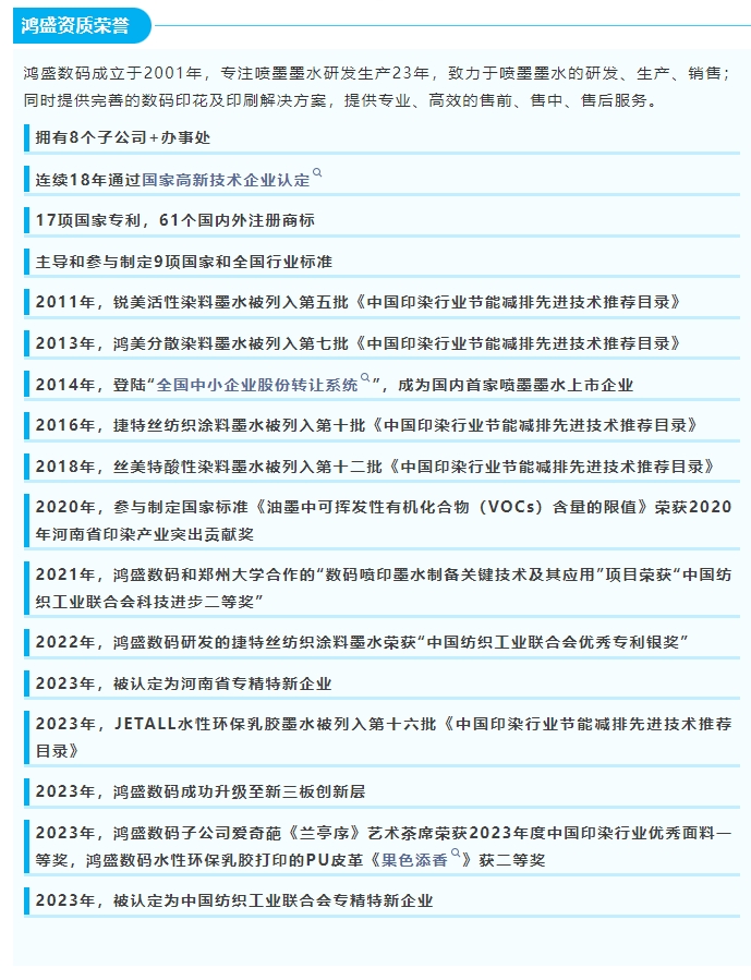 鄭州鴻盛數(shù)碼科技股份有限公司成立于2001年,是一家專注噴墨墨水研發(fā)、生產(chǎn)、銷售的國家高新技術(shù)企業(yè),噴墨行業(yè)中國新三板創(chuàng)新層企業(yè)(股票代碼430616),公司自成立以來,始終致力于數(shù)碼噴墨技術(shù)的研究、開發(fā)及應(yīng)用推廣,開發(fā)、生產(chǎn)適應(yīng)數(shù)碼噴墨技術(shù)進步的功能性、環(huán)保型噴墨墨水,并向客戶提供數(shù)碼噴墨印刷整體解決方案和服務(wù)。