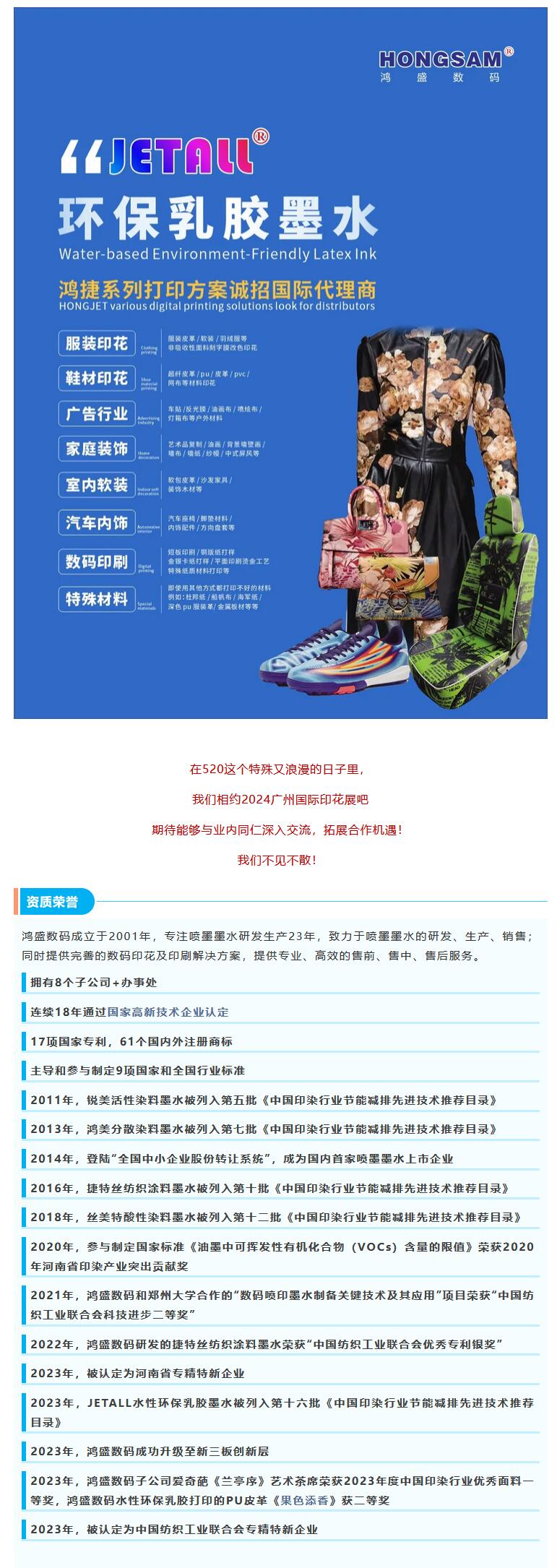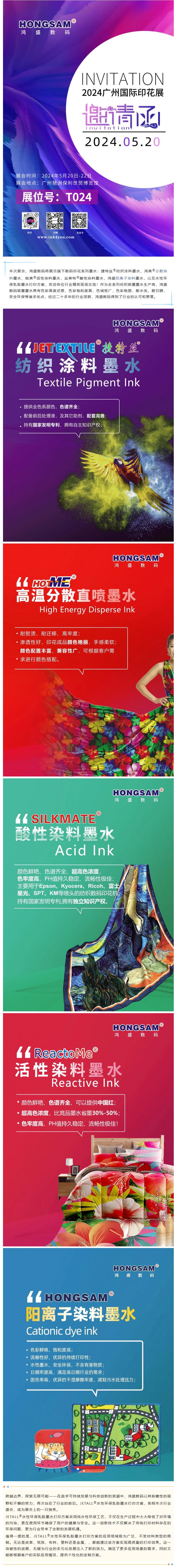 在浪漫滿溢的5月20日,備受矚目的2024廣州國(guó)際紡織制衣及印花工業(yè)博覽會(huì)(簡(jiǎn)稱“廣州國(guó)際印花展”)將于2024年5月20日-22日在廣州琶洲保利世貿(mào)博覽館盛大開幕。此次展會(huì)不僅是一場(chǎng)紡織印花行業(yè)的盛會(huì),更是一次創(chuàng)新、技術(shù)與藝術(shù)的完美碰撞。屆時(shí),鴻盛數(shù)碼(展位號(hào):T024)將攜旗下紡織系列墨水及打印方案隆重亮相,敬請(qǐng)期待!