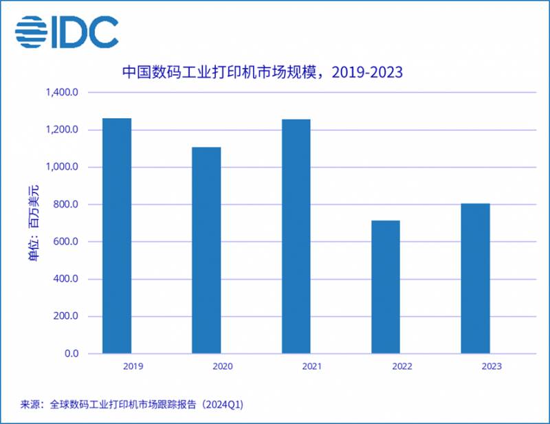 IDC于近日發(fā)布的《全球工業(yè)打印機市場跟蹤報告,2024Q1》顯示,2023年,中國國內(nèi)數(shù)碼工業(yè)打印機整體市場規(guī)模收入高達8.1億美元,同比上升13.0%。其中大幅面數(shù)碼印刷機同比上漲12.4%, 數(shù)碼紡織印花機同比上升9.2%,數(shù)碼工業(yè)標簽和包裝印刷機同比上27.2%。