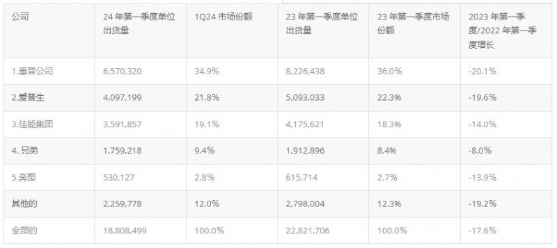 2024 年第一季度全球硬拷貝外圍設(shè)備市場、單位出貨量、公司份額和同比增長(基于單位出貨量)