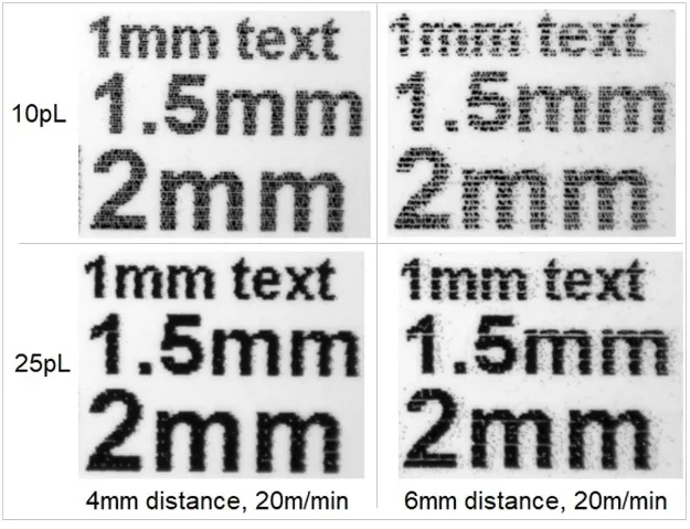 實(shí)例:在較長(zhǎng)拋射距離下,壓電式打印頭會(huì)降低噴墨精度,同時(shí)增加衛(wèi)星墨滴數(shù)量。
