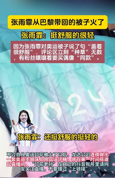 這兩天,張雨霏從巴黎帶回的一條被子在抖音火了——張雨霏的助理教練,在他的抖音賬號“霏蝶游泳”上發(fā)布的“滿載而歸,張雨霏奧運歸來后的突擊開箱第二集”中,因為張雨霏對奧運被子說了句“蓋著很舒服”,評論區(qū)立刻“種草”無數(shù),有粉絲嚷嚷著要買偶像“同款”。