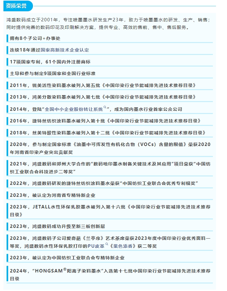 經(jīng)過(guò)篩選和專家評(píng)審,共有87項(xiàng)新產(chǎn)品和42項(xiàng)新技術(shù)最終入選《“紡織之光”2024 年度紡織行業(yè)專精特新新技術(shù)、 新產(chǎn)品推介合作目錄》,其中鴻盛數(shù)碼有3項(xiàng)入選 ,分別是:新產(chǎn)品2項(xiàng)——JETALL水性環(huán)保乳膠墨水、水性納米顏料墨水,新技術(shù)1項(xiàng)——數(shù)碼噴印墨水制備關(guān)鍵技術(shù)。