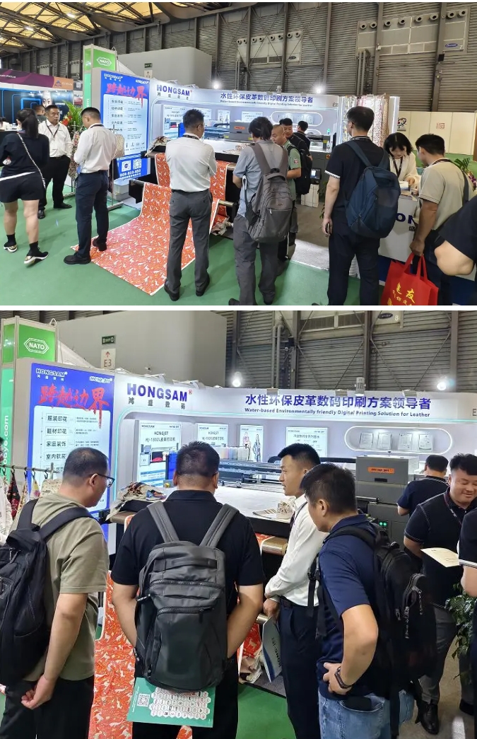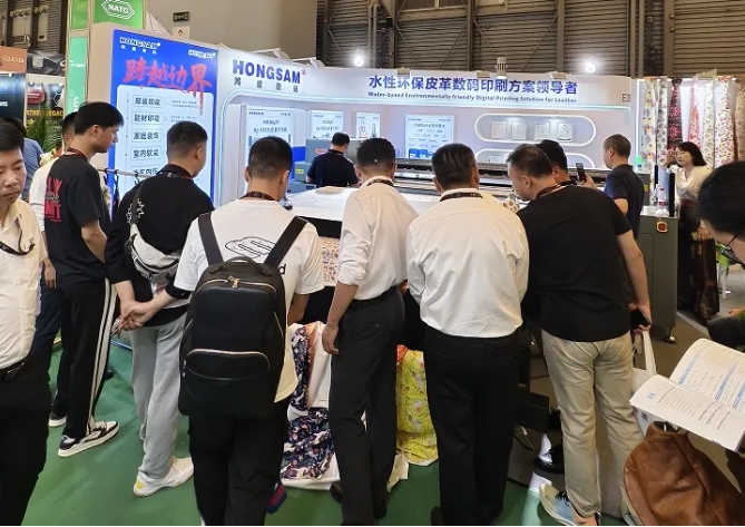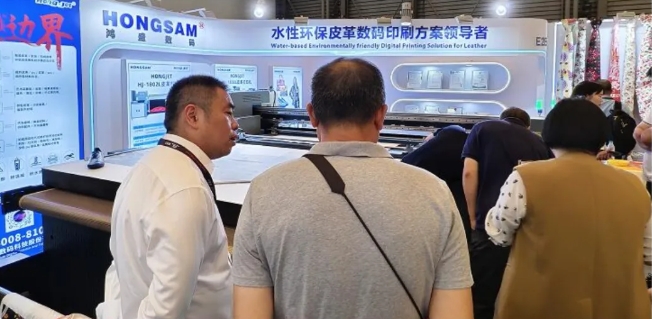 鴻盛數(shù)碼深耕噴墨行業(yè)23年,本次展會攜旗下HJ-1808L皮革打印機、HJ-1802L皮革打印機、水性乳膠打印方案、鴻盛數(shù)碼全系列墨水(數(shù)碼印花、數(shù)碼影像、數(shù)碼印刷)等多款主力產(chǎn)品重磅出席此次展會。水性乳膠打印皮革工藝成為展會焦點,為皮革行業(yè)發(fā)展提供了新的思路與方向,吸引了眾多觀眾前來了解咨詢。