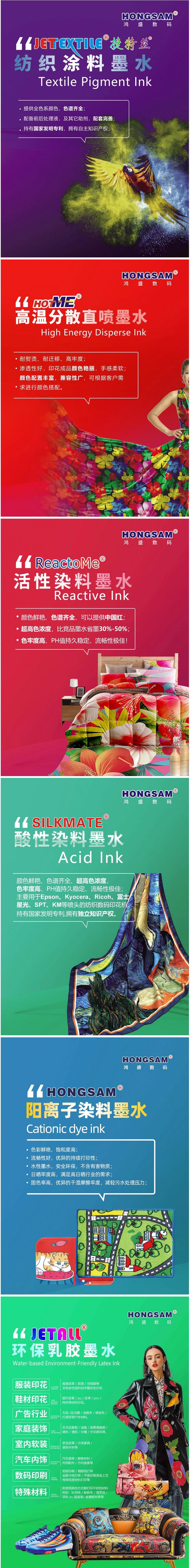 鴻盛數(shù)碼(展位號:H5-A09)將攜旗下全系列紡織噴墨墨水(捷特絲®紡織涂料墨水、鴻美®分散染料墨水、銳美®活性染料墨水、絲美特®酸性染料墨水、HONGSAM®陽離子染料墨水)、HJ-1808L乳膠打印機(jī)、以及水性環(huán)保乳膠打印方案、鴻捷全數(shù)碼柯式燙畫解決方案等多款主力產(chǎn)品重磅出席此次展會(huì)。