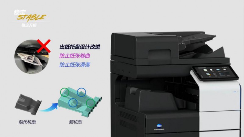 相較于前代產(chǎn)品,柯尼卡美能達(dá)全新 i 系列在穩(wěn)定性上也進(jìn)行了優(yōu)化升級,尤為突出的是出紙托盤的創(chuàng)新調(diào)整,新設(shè)計(jì)能夠有效防止紙張卷曲及滑落現(xiàn)象,使得穩(wěn)定性顯著提升。