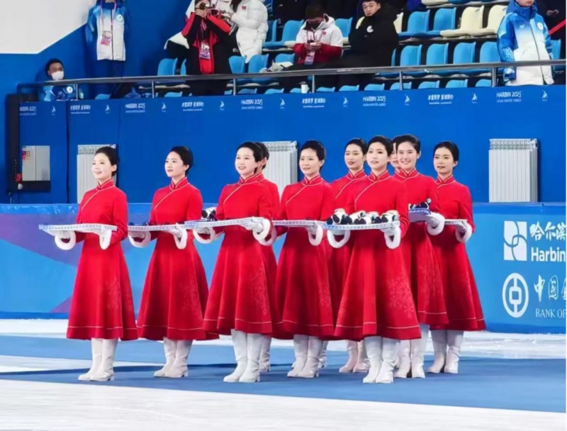 2月9日,本屆亞冬會進(jìn)入第二個比賽日,中國隊在賽場上奮力拼搏,力爭金牌。在頒獎典禮上,禮儀小姐們身著的紅色頒獎禮服成為了全場焦點(diǎn)。