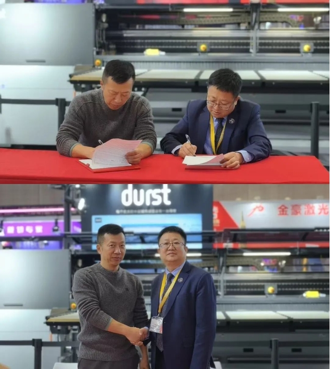 此外,展會現場還迎來了一個令人振奮的消息。深圳大昆侖文化發(fā)展有限公司總經理李俊先生與上海印拓科技有限公司總經理戴珺先生在展位上正式簽訂了一臺Durst P5 350混合打印機的采購合同。據悉,大昆侖的第一臺Durst P5