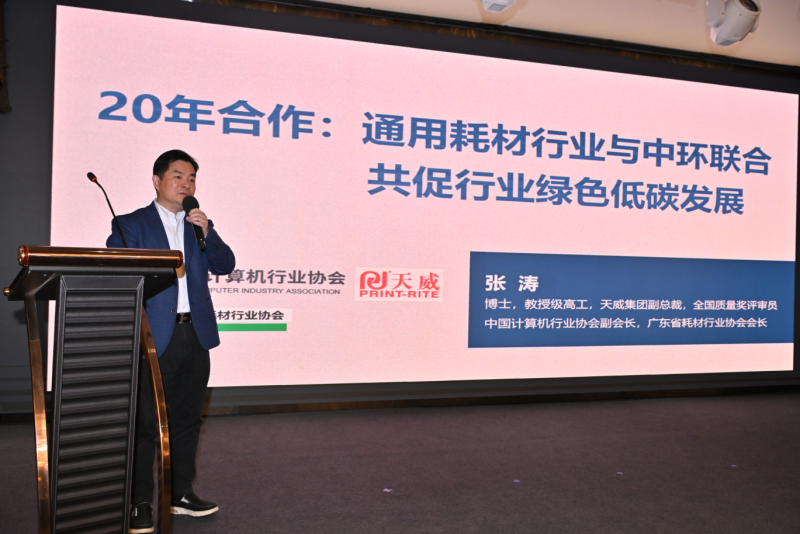 會上,張濤博士在《20年合作——通用耗材行業(yè)與中環(huán)聯(lián)合共促行業(yè)綠色低碳發(fā)展》主題報告中,回顧了天威與中環(huán)聯(lián)合認(rèn)證中心二十年來攜手推動行業(yè)綠色升級的歷程。對天威作為行業(yè)奠基企業(yè),積極從創(chuàng)新、綠色環(huán)保探索和推動行業(yè)可持續(xù)發(fā)展作了分享交流。