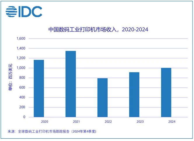 根據(jù) IDC 最新發(fā)布的《全球工業(yè)打印機市場跟蹤報告(2024年第4季度)》,2024年中國數(shù)碼工業(yè)打印機市場整體收入達到10.0億美元,實現(xiàn)了9.5%的同比增長。這一增長主要得益于大幅面數(shù)碼印刷機、數(shù)碼紡織印花機以及數(shù)碼工業(yè)標簽和包裝印刷機的顯著增長。