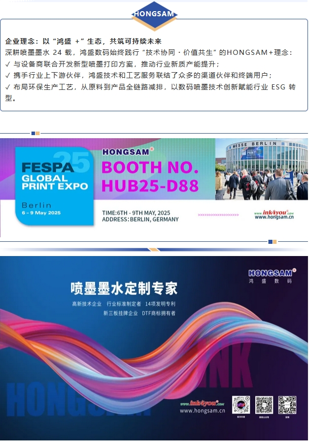 2025 年 5 月 6-9 日,全球印刷領(lǐng)域極具影響力的年度盛會 ——FESPA全球印刷展覽會,將在德國柏林展覽中心盛大開幕!作為深耕數(shù)碼印花領(lǐng)域二十余載的創(chuàng)新引領(lǐng)者,鴻盛數(shù)碼攜明星數(shù)碼印刷設(shè)備+解決方案亮相HUB25-D88展位,誠邀全球合作伙伴及行業(yè)同仁蒞臨現(xiàn)場體驗(yàn) “數(shù)字賦能 + 環(huán)保印刷” 的前沿技術(shù),以技術(shù)對話世界,以創(chuàng)新定義未來!