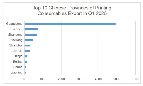 從各省出口表現(xiàn)來看,廣東省在大多數(shù)打印耗材出口領(lǐng)域保持領(lǐng)先地位。第一季度,廣東省出口額達(dá)49.3億元人民幣,占全國出口總額的近60%。這一領(lǐng)先優(yōu)勢在噴墨打印機(jī)、激光打印機(jī)和復(fù)印機(jī)耗材等大多數(shù)領(lǐng)域均得以延續(xù)。然而,在彩色色帶領(lǐng)域,廣東省的優(yōu)勢地位有所減弱。盡管廣東省仍以1.13億元人民幣的彩色色帶出口額位居第一,但與浙江省的差距正在縮小,浙江省緊隨其后,出口額達(dá)1.088億元人民幣。