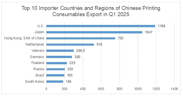 第一季度,美國是中國激光和復(fù)印機(jī)耗材的最大買家,進(jìn)口額約為11.9億元人民幣。其次是日本(10.5億元人民幣)、中國香港特別行政區(qū)(7.53億元人民幣)、荷蘭(5.19億元人民幣)和越南(2.99億元人民幣)。這五大中國打印耗材出口目的地與2024年相比沒有變化。