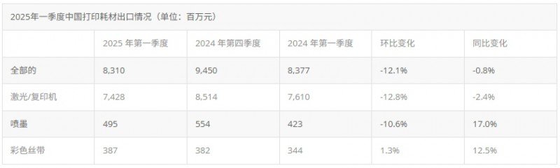 根據(jù)中國海關(guān)截至3月底的數(shù)據(jù),2025年第一季度中國打印耗材出口環(huán)比下降,盡管尚未受到中美關(guān)稅戰(zhàn)的影響。