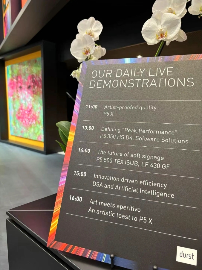 在我們的展位上,每天都會進(jìn)行好幾場印刷系統(tǒng)和軟件解決方案的現(xiàn)場演示,讓您近距離地了解Durst的創(chuàng)新技術(shù)。