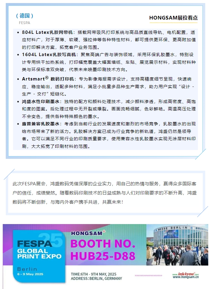 5月6日,為期四天的2025德國(guó)柏林FESPA全球印刷博覽會(huì)順利開(kāi)幕,作為數(shù)碼印刷行業(yè)的全球盛會(huì),當(dāng)然不能缺少鴻盛數(shù)碼的身影。本屆展會(huì),鴻盛數(shù)碼攜帶其全系列噴墨墨水(數(shù)碼印花類 數(shù)碼影像類 數(shù)碼印刷類)及三種不同的數(shù)碼印刷解決方案亮相,捷傲®水性乳膠打印依舊是展會(huì)中的重頭戲,成為展會(huì)中的一大亮點(diǎn)。