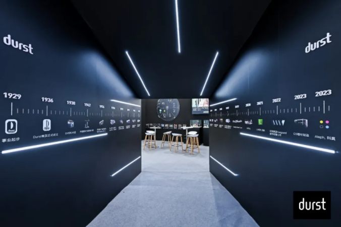 Durst展位的設(shè)計(jì)以“時(shí)光穿梭”為核心概念,分為三大主題區(qū)域:“歷史隧道”、“群峰之巔”和“未來之境”。觀眾步入展位,仿佛進(jìn)入了一條時(shí)空隧道,親身感受Durst如何從一家影像行業(yè)的先驅(qū)企業(yè),發(fā)展成為全球數(shù)碼印刷技術(shù)的領(lǐng)導(dǎo)者。